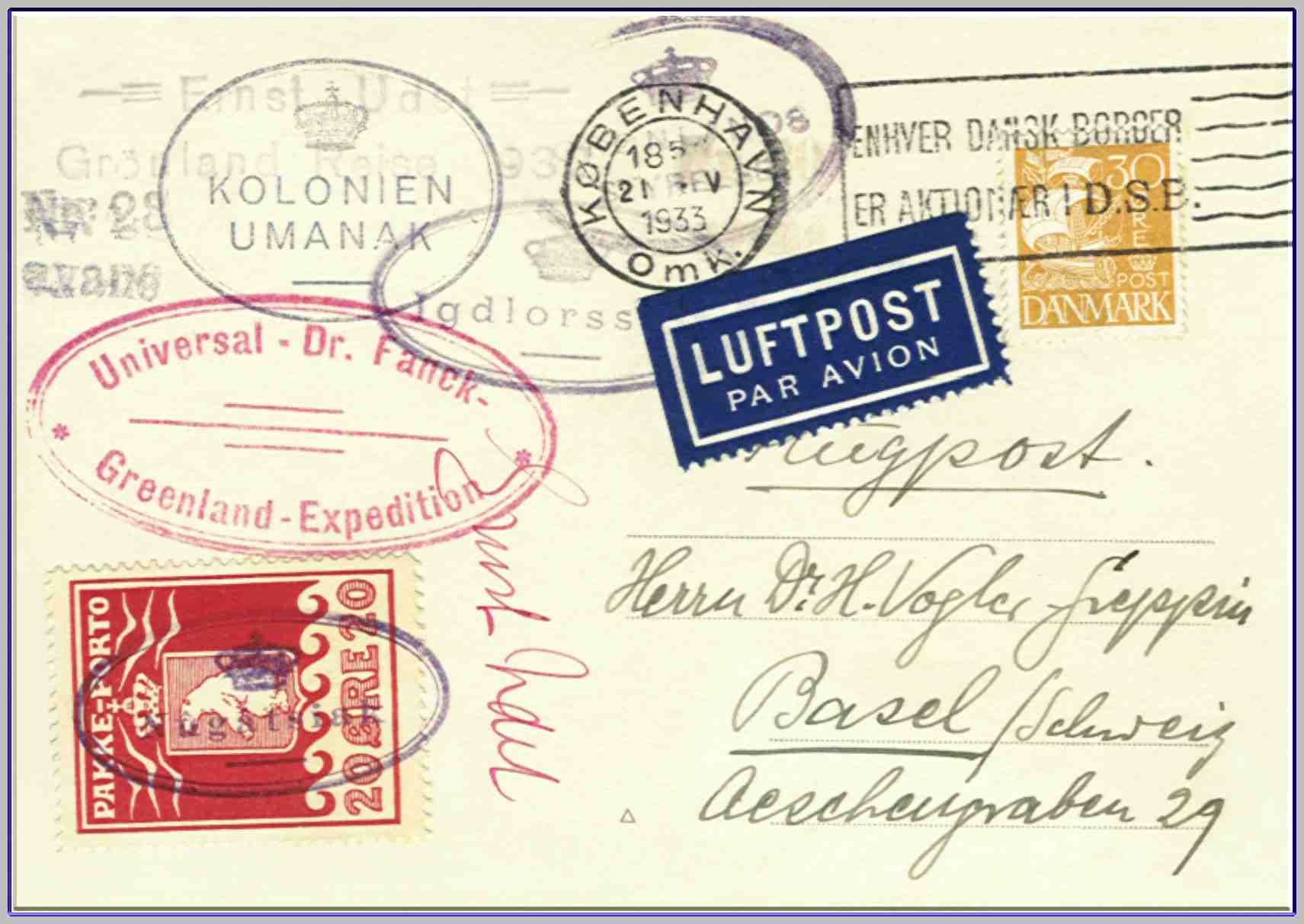 Udet-Flugpost eines der Versorgungsflüge der Dr. Fanck-Expedition in Grönland, 1932. Ein "Vogler-Greppin-Beleg" und eine Rarität der internationalen Aerophilatelie! Attest