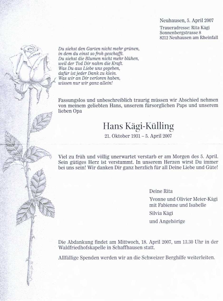 Heute erhielt ich die traurige Nachricht vom Tode unseres Freundes Hans Kägi.